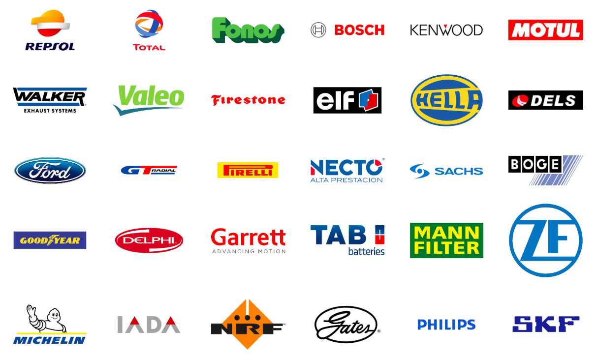 En nuestra tienda encontrarás recambios originales y equivalentes de primeras marcas, todos con garantía y una calidad contrastada. Trabajamos con fabricantes líderes en el sector como Motul, Valeo, Michelin, Gates, Brembo, Philips, Delphi, Elf, Kenwood, GT Radial, Firestone, Sachs, Hella, Mann Filter, Pirelli, SKF, Pierburg, ZF, IADA o Goodyear, entre otros.
